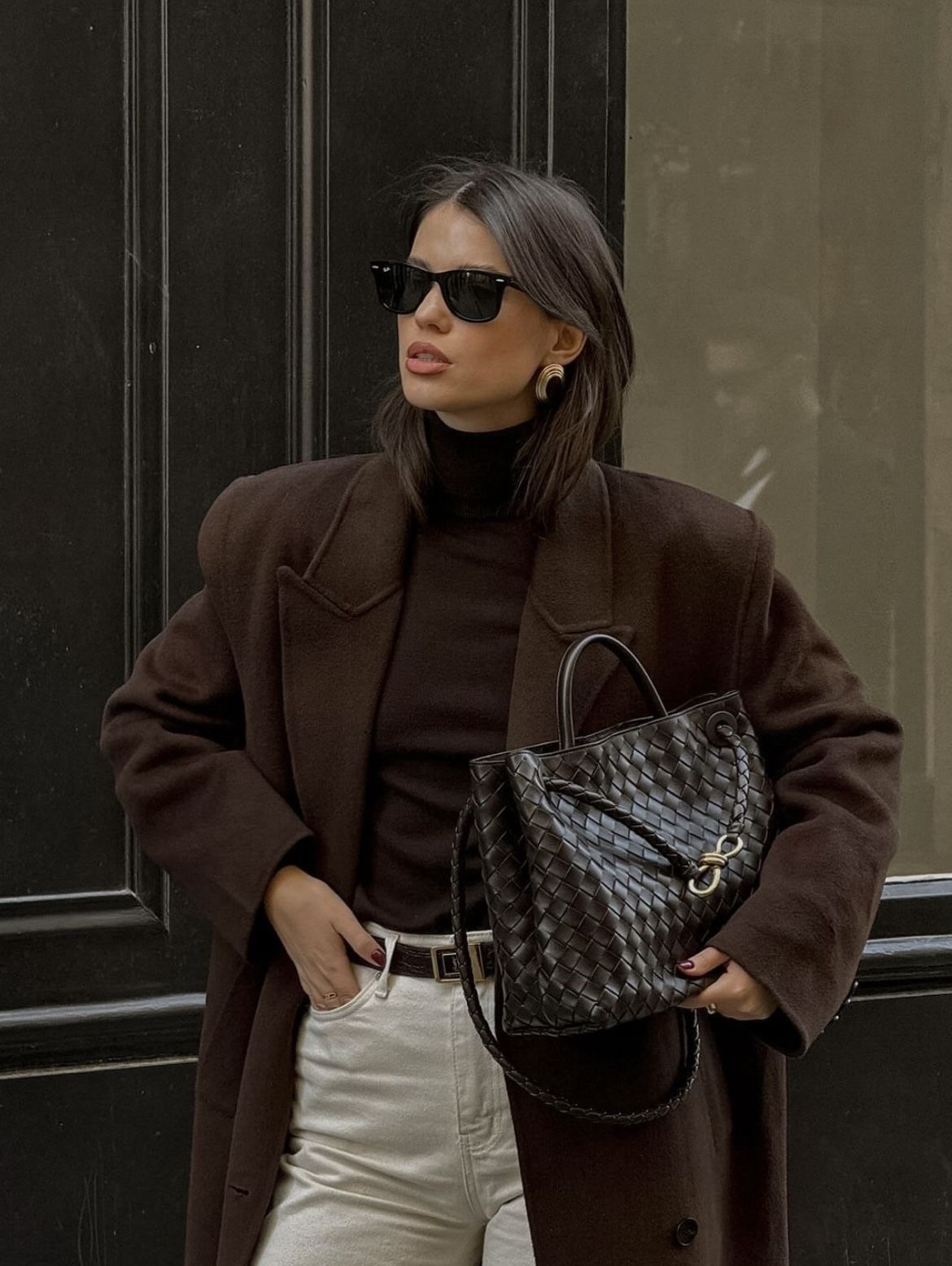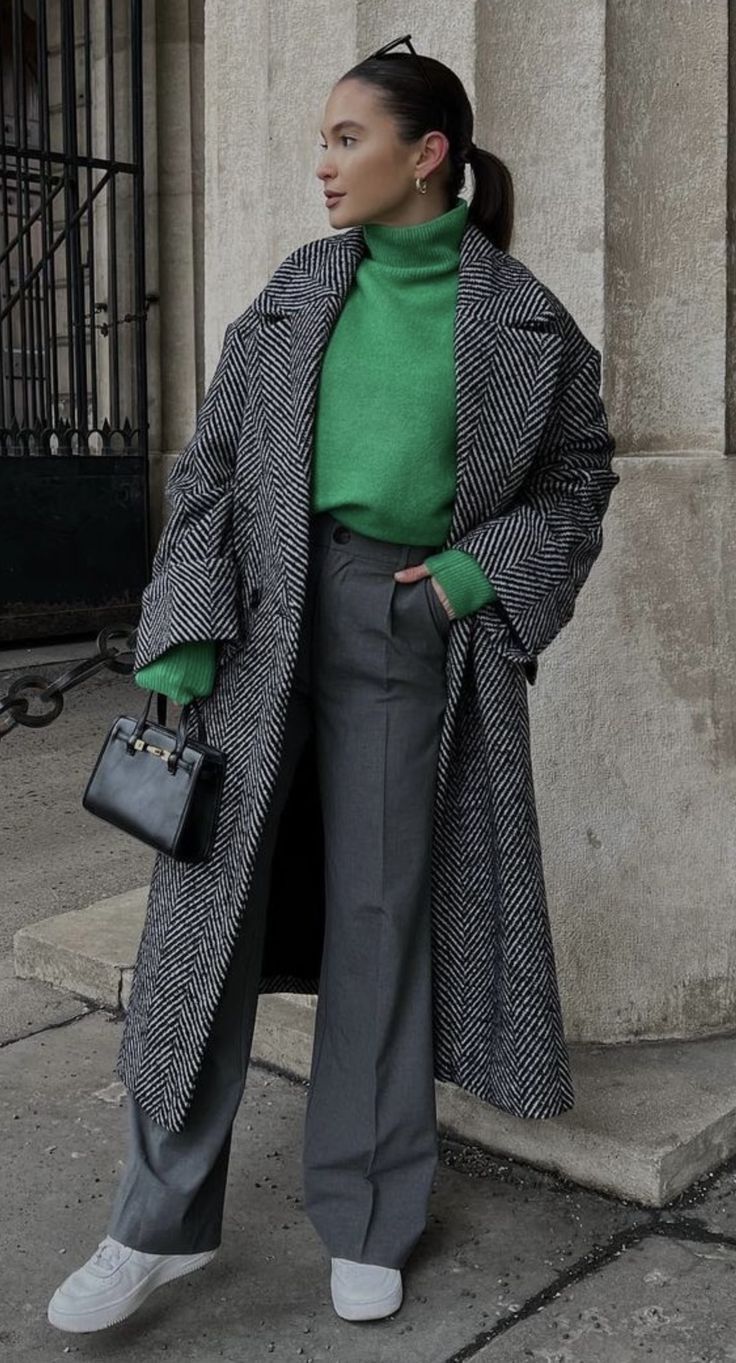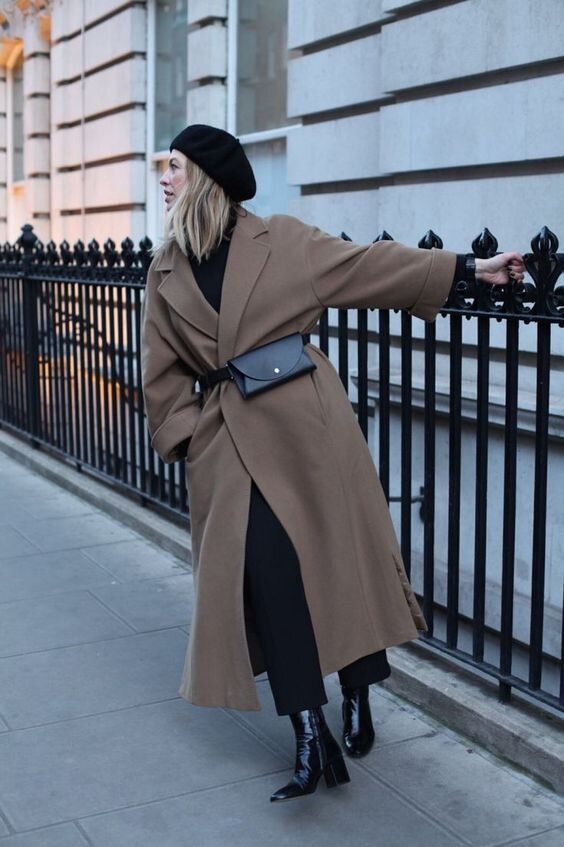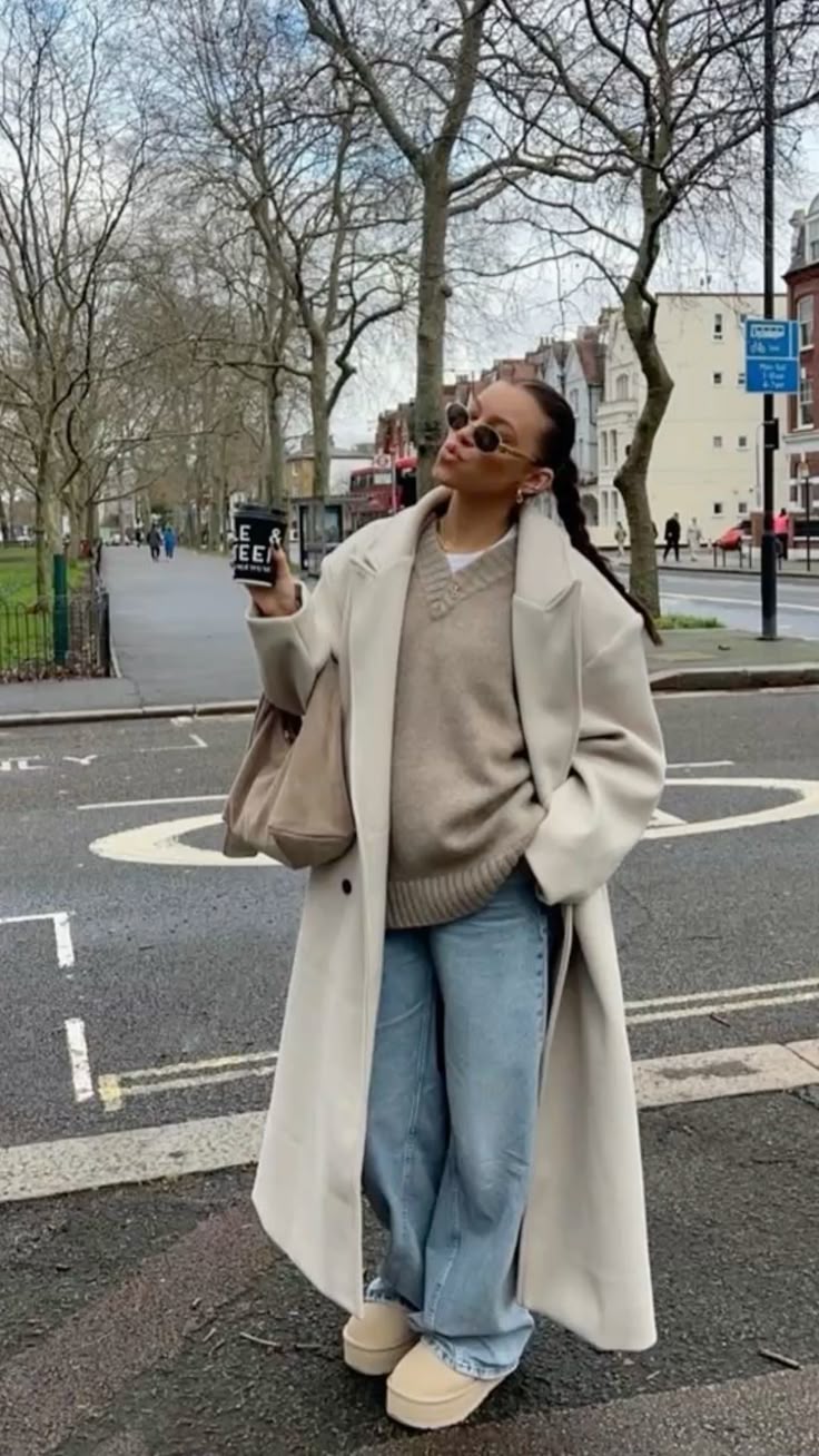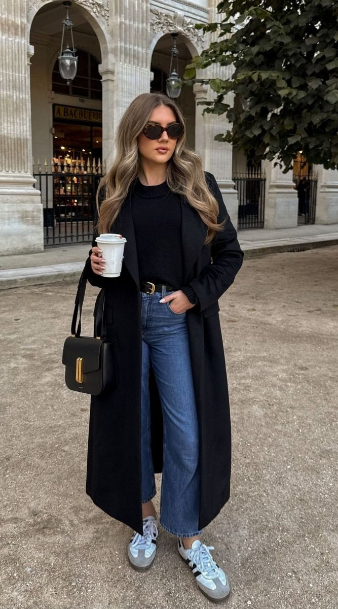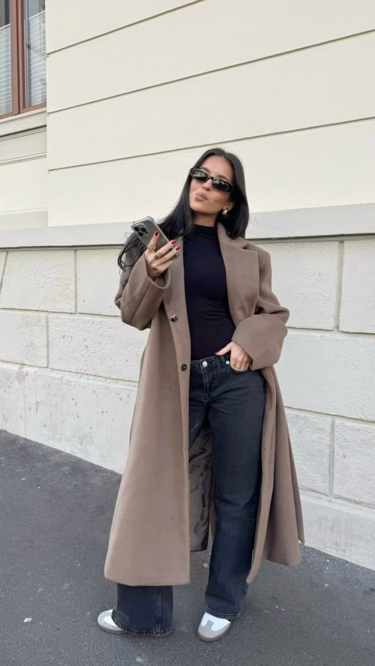 A taupe long coat paired with black jeans feels business casual but still street-ready. The sharp coat cut flatters most women, particularly when paired with slim or straight cuts underneath. This outfit is perfect for daily work, yet it still plays into a men street style vibe when styled with sneakers.