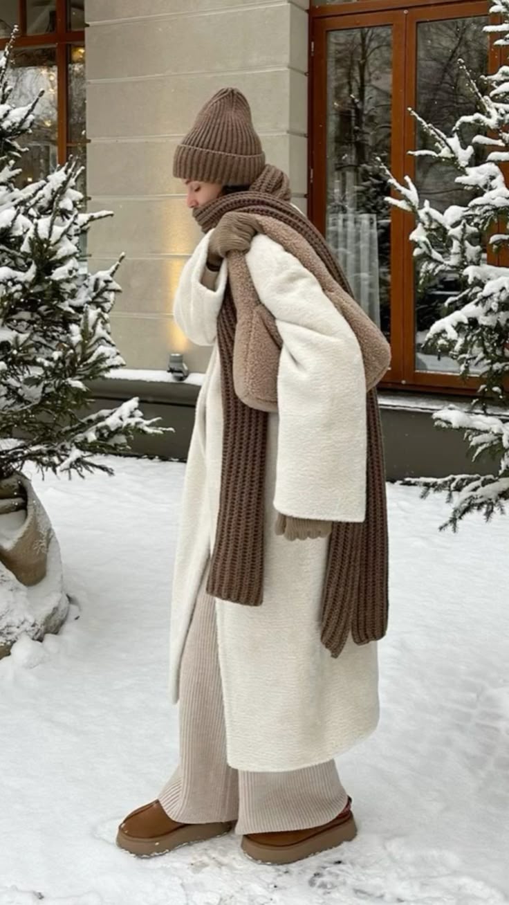 Head-to-toe cream is the chic definition of casual winter outfits 2025. This look works wonders for tall women who love monochrome aesthetic outfits, though it might wash out very fair skin tones without the right makeup. It’s excellent for winter brunches, ski resort lounging, or even business casual creative workspaces.