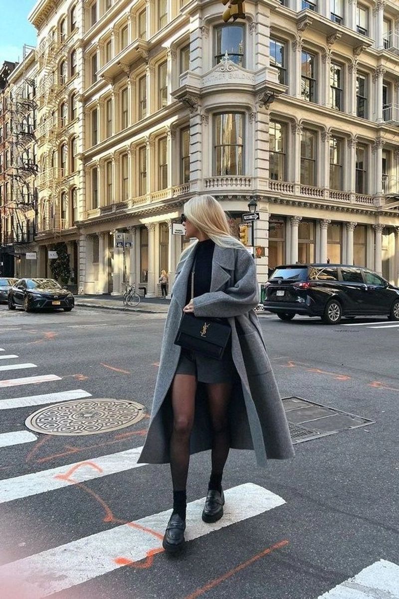 Casual winter outfits 2025–2026 aren’t all about oversized pants—sometimes a dressy twist makes all the difference. A long gray coat over a mini skirt is a bold mix of cute and classy, though best suited for women comfortable with showing legs in cold weather (hello, tall figures with confidence). Not the most practical for freezing days, but perfect for city fashion moments or dinner out.