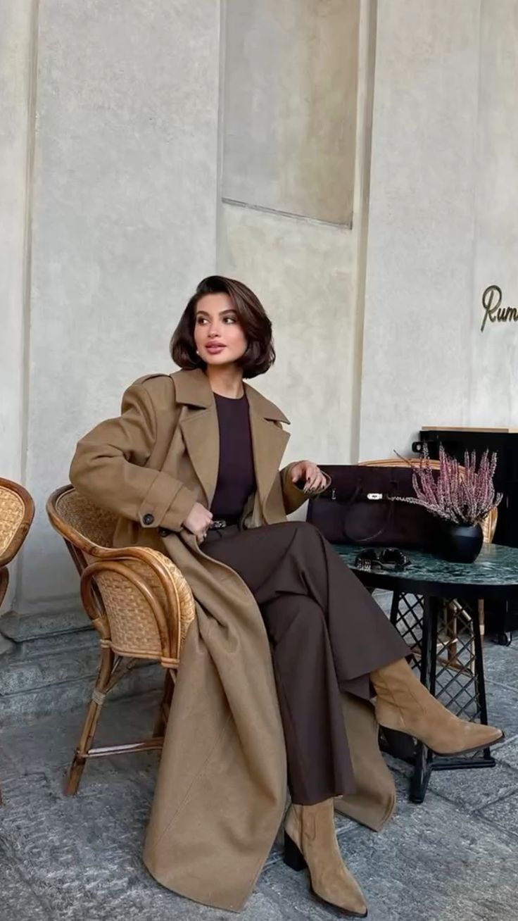 This dressy layered camel look blends business polish with casual winter outfits 2025 charm. Perfect for women heading to work meetings or classy cafés, it works especially well for taller builds. The tailored shape may feel heavy for petite frames without proportion balancing.