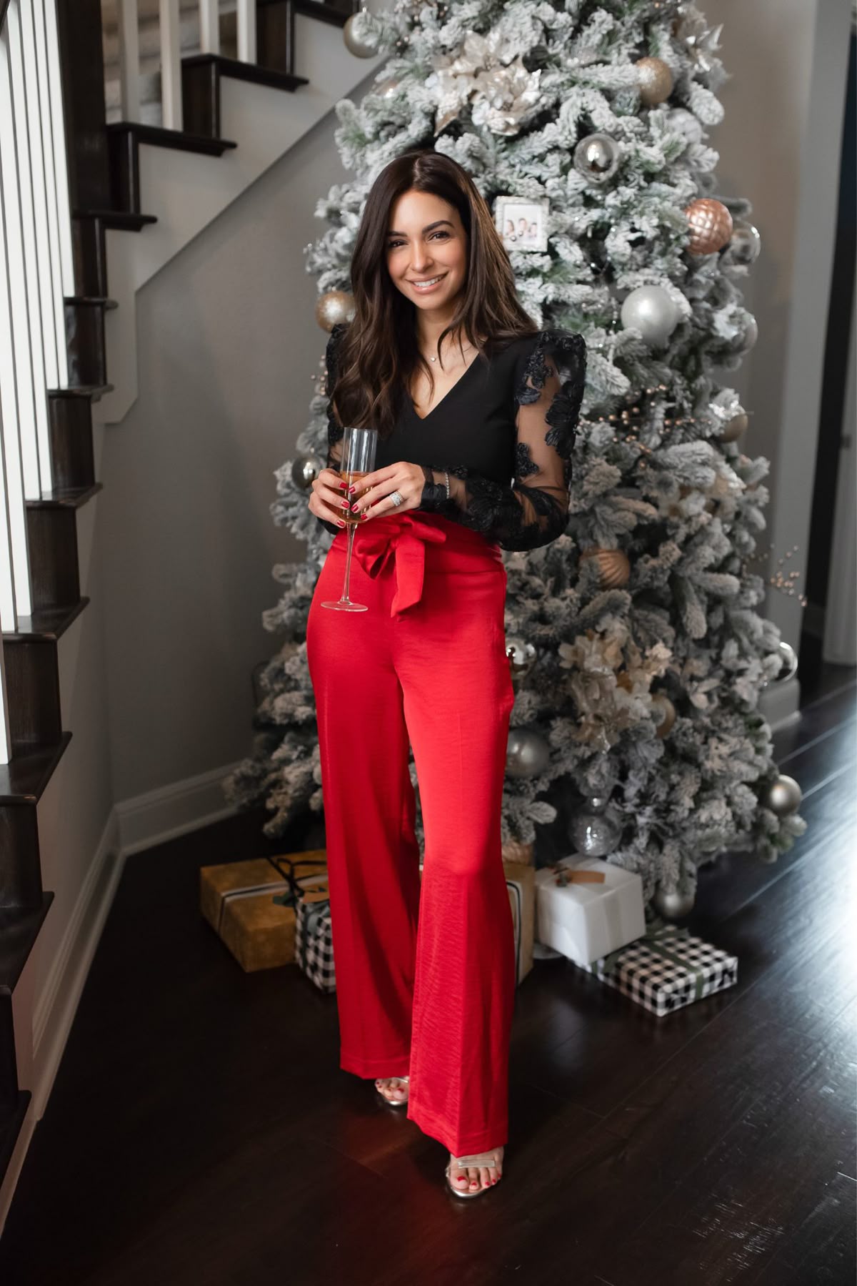 Every December wardrobe deserves a red statement piece — and these high-waisted satin pants deliver it flawlessly. Teamed with a black lace-sleeve top, this outfit radiates classy confidence. Perfect for family dinners, elegant soirées, or a Nyc rooftop party, it’s proof that holiday dressing can be both bold and refined.