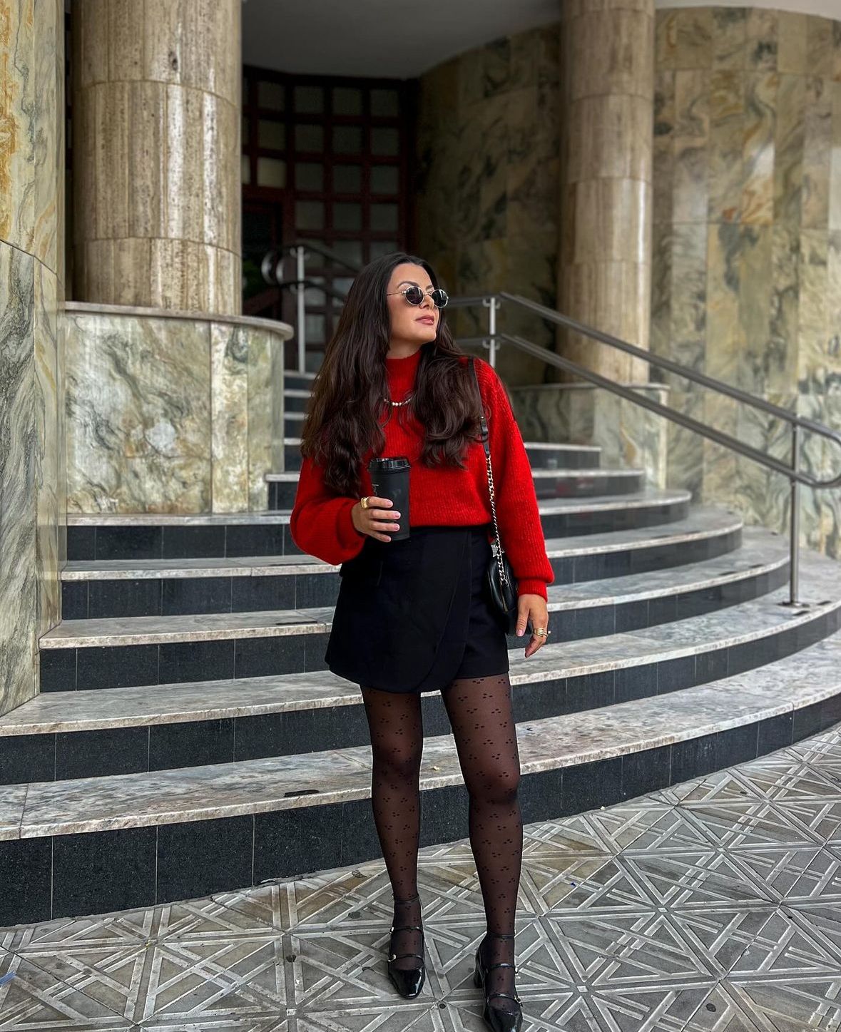 For those who love their ideas on the practical side, this one’s a winner. A cropped red sweater meets a black mini skirt and sheer polka-dot tights — equal parts casual and classy. It’s a city-ready outfit that could easily take you from coffee runs to festive dinners. A perfect blend for women who want comfy, low-maintenance holiday style with inspo potential.