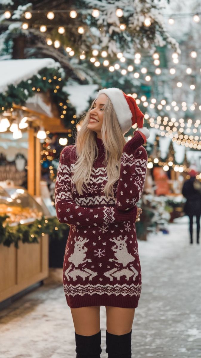 There’s something timeless about a red sweater dress in winter — and this one captures that holiday-market aesthetic flawlessly. The reindeer-patterned knit hugs the body just right, keeping things comfy but chic. It’s the kind of casual outfit that transitions beautifully from a snowy stroll to a family gathering, with a playful wink thanks to the Santa hat. The silhouette flatters medium to tall figures best — the longer hem and slim fit elongate the body, while the bold pattern draws the eye upward.