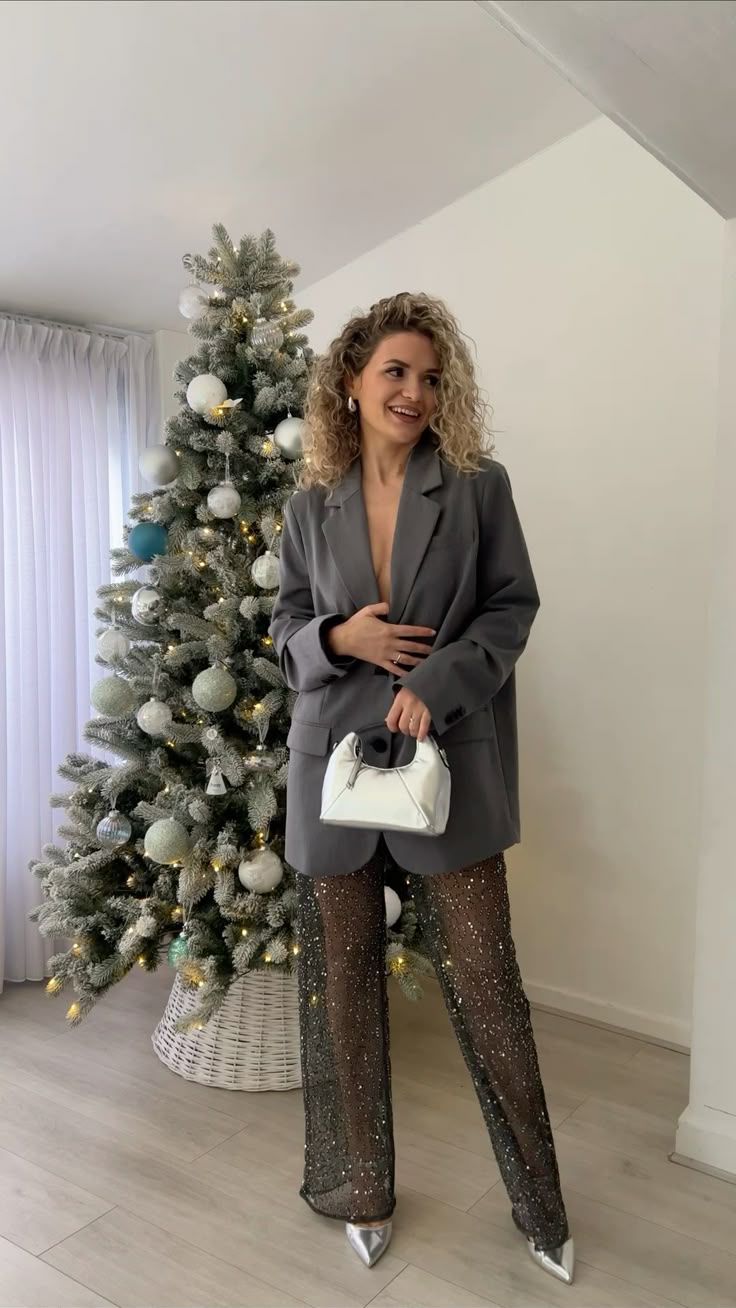 There’s something irresistibly classy about pairing an oversized gray blazer with glitter mesh pants. It’s a modern take on festive fashion — ideas for women classy yet contemporary. This outfit works well for women who prefer balance: masculine tailoring up top, sheer sparkle below. Ideal for indoor events, family gatherings, or even York apartment parties where you want to stand out subtly.