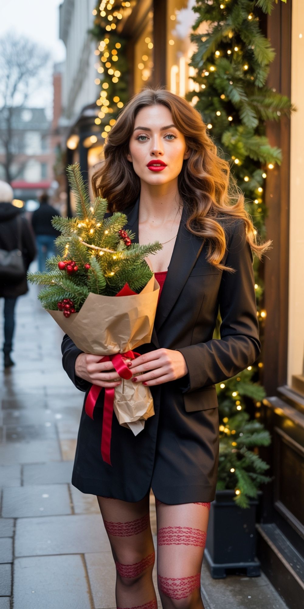 This is Christmas outfit inspo straight from the streets of NYC — modern, bold, and utterly unforgettable. A black oversized blazer meets fiery red tights and hot pink heels — a daring combination that screams classy confidence with a wink of rebellion. It’s one of those ideas for women classy enough for a dinner party yet edgy enough for a fashion aesthetic photo outside a boutique café. Best for taller figures or anyone who loves elongated lines and structured tailoring.