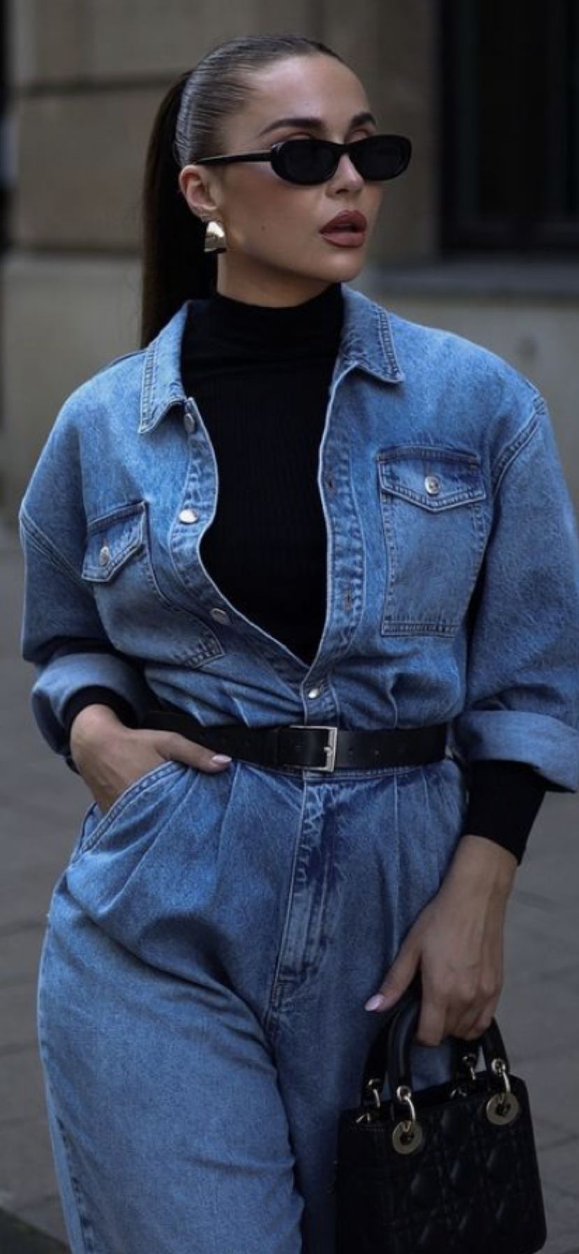 The deep blue denim jumpsuit here becomes a total statement, sharpened by a fitted black turtleneck woven underneath. The slick ponytail, angular sunglasses, and sculptural earrings elevate the outfit toward a modern, almost architectural mood. This look is fantastic for women with balanced proportions or long lines through the torso — the belted waist creates clear definition, which is ideal for straight or rectangular shapes. It’s also a smart outfit for urban days when you want polish without overthinking; however, it might feel heavy for summer or settings where lighter textures are expected.