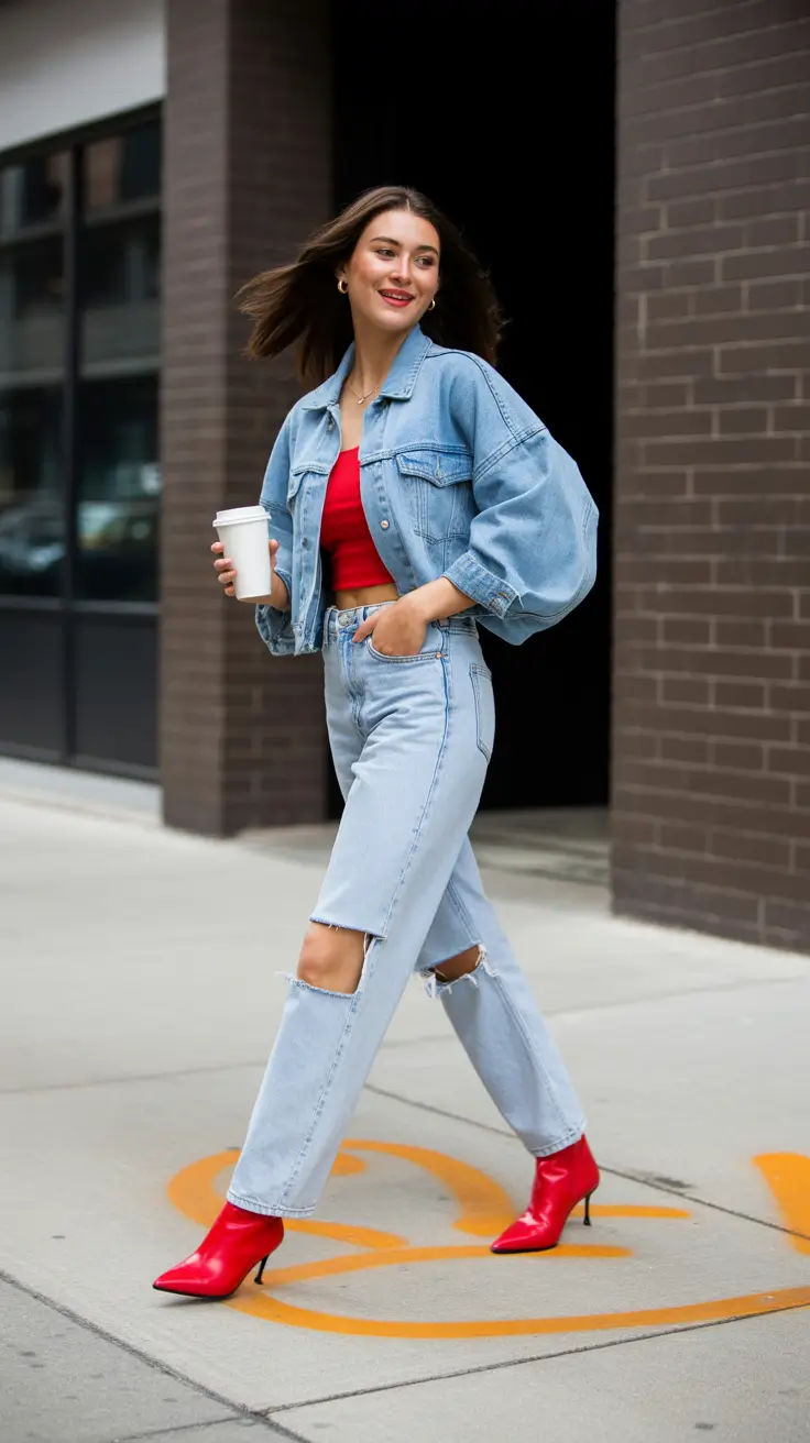 There’s something irresistible about pairing a washed denim set with a sharp shot of color, and here the vibrant top and red and boots create a playful, energetic contrast. The cropped jacket with balloon sleeves gives a youthful, almost Y2K silhouette, while the ripped knees keep it feeling easy and casual. This outfit shines on anyone who enjoys a shorter torso effect and wants to highlight the waist—great for petites and hourglass figures. Perfect for brunch, coffee runs, or early summer outings where comfort meets personality.