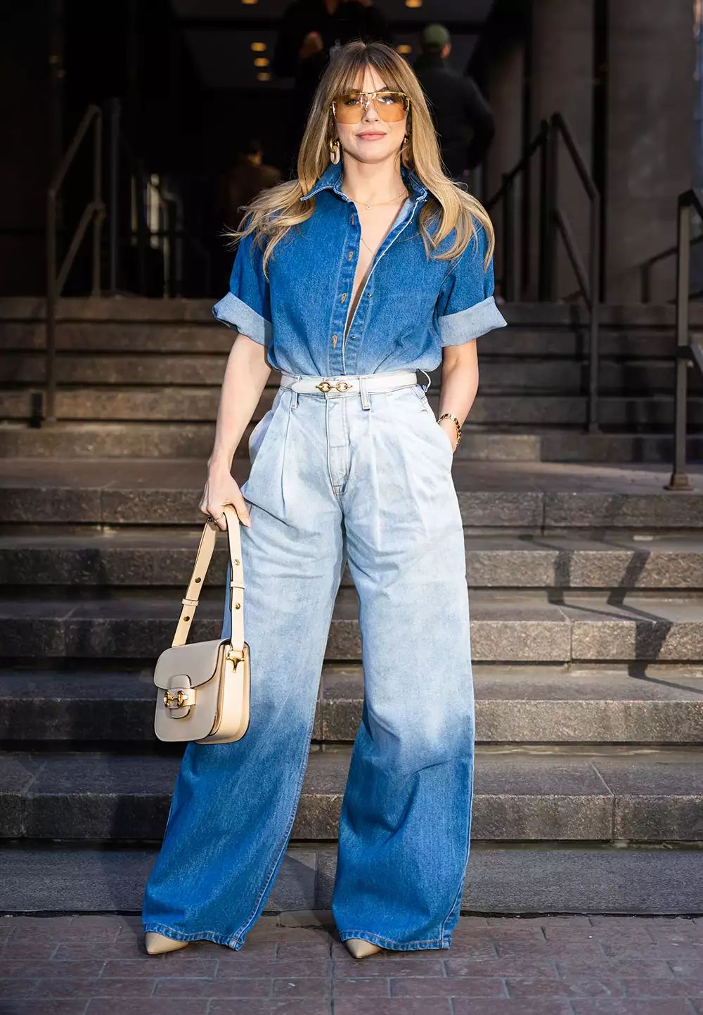 Here the denim takes a refined, almost polished turn with a deep-V button-down tucked into structured wide leg jeans. The earthy belt grounds the cool blue tones, creating a subtly vintage vibe reminiscent of 90s street fashion. This silhouette is especially flattering for curvy and hourglass figures thanks to the waist emphasis. It’s ideal for daytime strolling, coffee dates, or elevated casual styling; less suited for formal events where sharper tailoring rules.