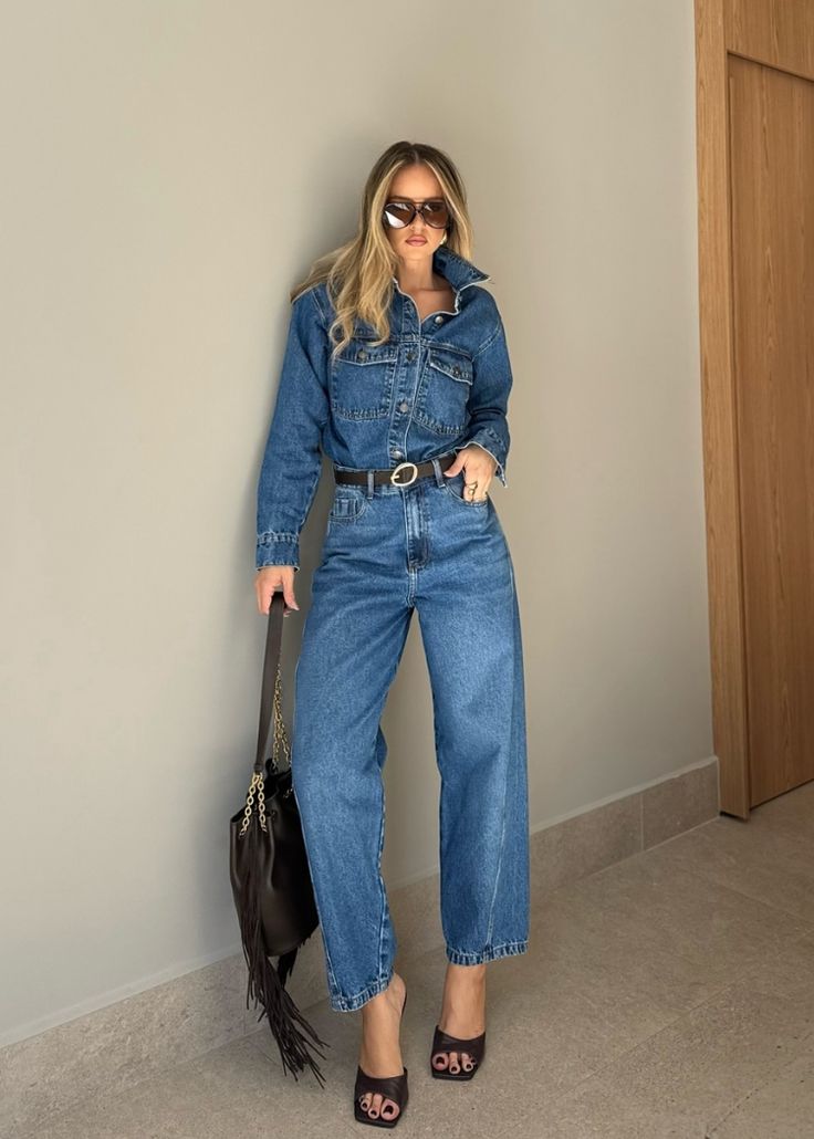 This full denim look is streamlined, modern, and deeply polished — exactly the kind of outfit that suits a city wardrobe. The medium dark wash and simple lines create a flattering vertical silhouette, especially for women with curves or broader shoulders. The black belt and bag sharpen the outfit, giving it a slight 90s minimalism.