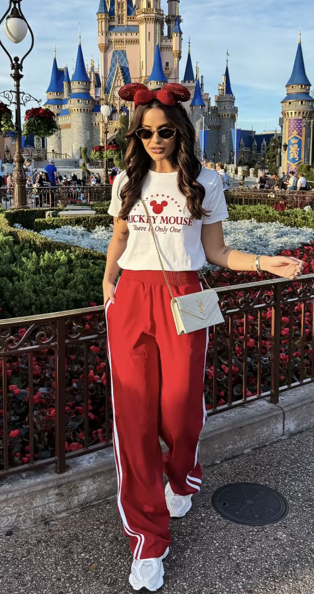 The relaxed red-and-white palette instantly feels cheerful, playful, and perfectly Disney. The relaxed-fit red track pants are the hero of the look — breathable, lightweight, and excellent for long park days where comfort is everything. The white graphic tee with the classic Mickey print makes it effortlessly cute, and the sparkly Minnie ears add just enough Disney flair without feeling costume-y. This style works especially well for women who prioritize comfort and want something practical for full-day walking. I’d avoid this look for very chilly days, as the lightweight fabrics won’t give enough warmth for early-morning winter rides or windy castle-view strolls.