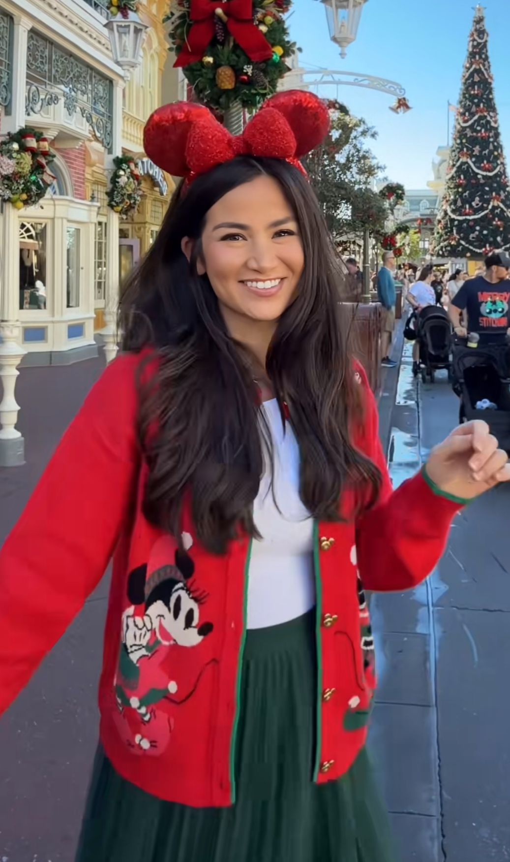 This outfit radiates pure Christmas nostalgia with its bright red Minnie cardigan paired with a deep green skirt—the ultimate holiday cute aesthetic. The look suits most body shapes thanks to the cardigan’s open fit and the skirt’s flow that elongates the figure. It’s perfect for December park days, holiday parades, and cozy snapshots under the tree. For warmer months, it becomes less practical, but in the crisp holiday season? It’s unbeatable.