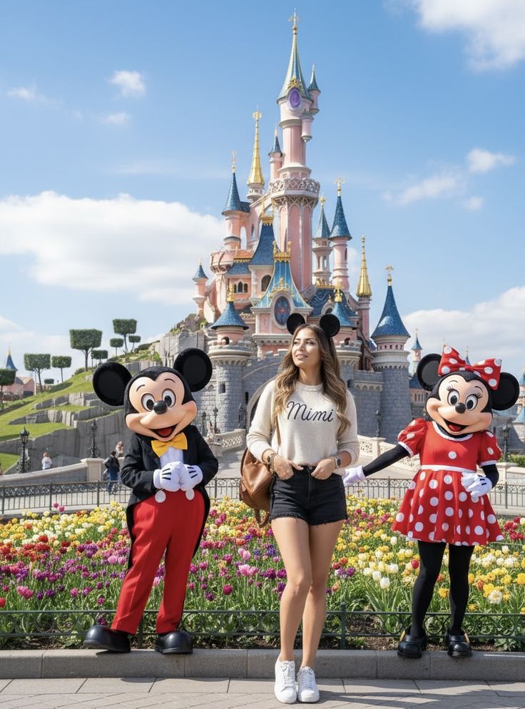 This one is the definition of laid-back chic—women summer energy with a hint of glossy sophistication. The fitted Mickey tee taps into that effortless aesthetic that Gen Z and Millennials both adore, and the tailored black leather shorts make it park-friendly without looking too casual. This outfit flatters most body types, especially those who like structure at the waist and movement at the hips. Not ideal for extremely hot days, but perfect for October visits or mild sunny afternoons.