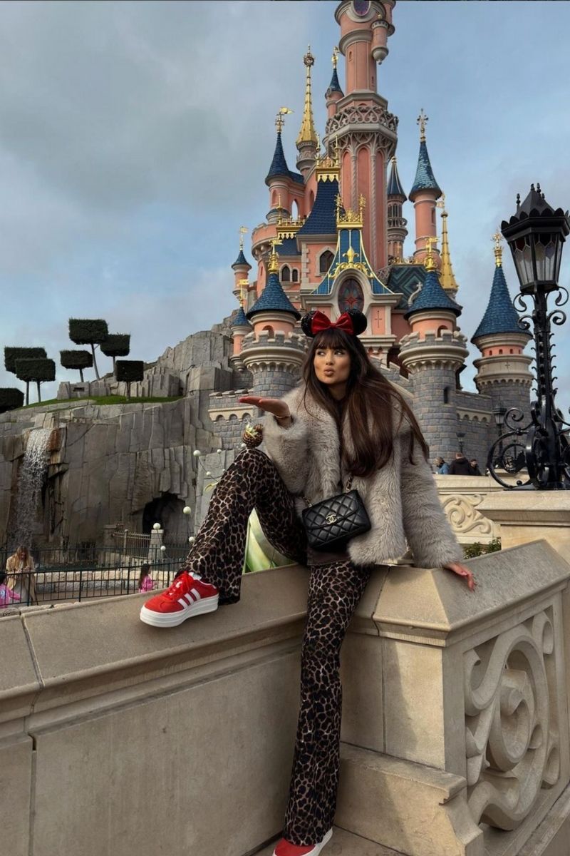 There’s something irresistibly luxe about combining a plush faux-fur jacket with wild-print bottoms right in front of Sleeping Beauty’s castle. This look works well for cold-weather park days, especially for women who love bold textures without sacrificing warmth—very winter friendly, very practical. The flared leopard pants help elongate the legs, so it’s especially flattering on straight or athletic shapes; however, petites may prefer a slightly cropped length to avoid overwhelming their frame. The red bow ears and bright sneakers keep the vibe playful, bringing in that cute Disney edge without losing the overall chicness.