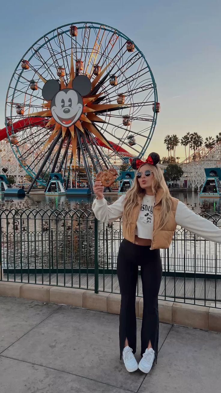This look has such an effortless women summer energy with a splash of cool-weather layering. The cropped cream Disney sweatshirt keeps everything casual, while the tan puffer vest brings a warm, golden undertone that plays so well with sunset light at Pixar Pier. The flared black leggings add shape and lengthen the legs, making this an ideal outfit for women wanting something flattering but fuss-free. It works beautifully for mild October days, transitional weather, or even a relaxed family trip where you need comfort from morning to fireworks.