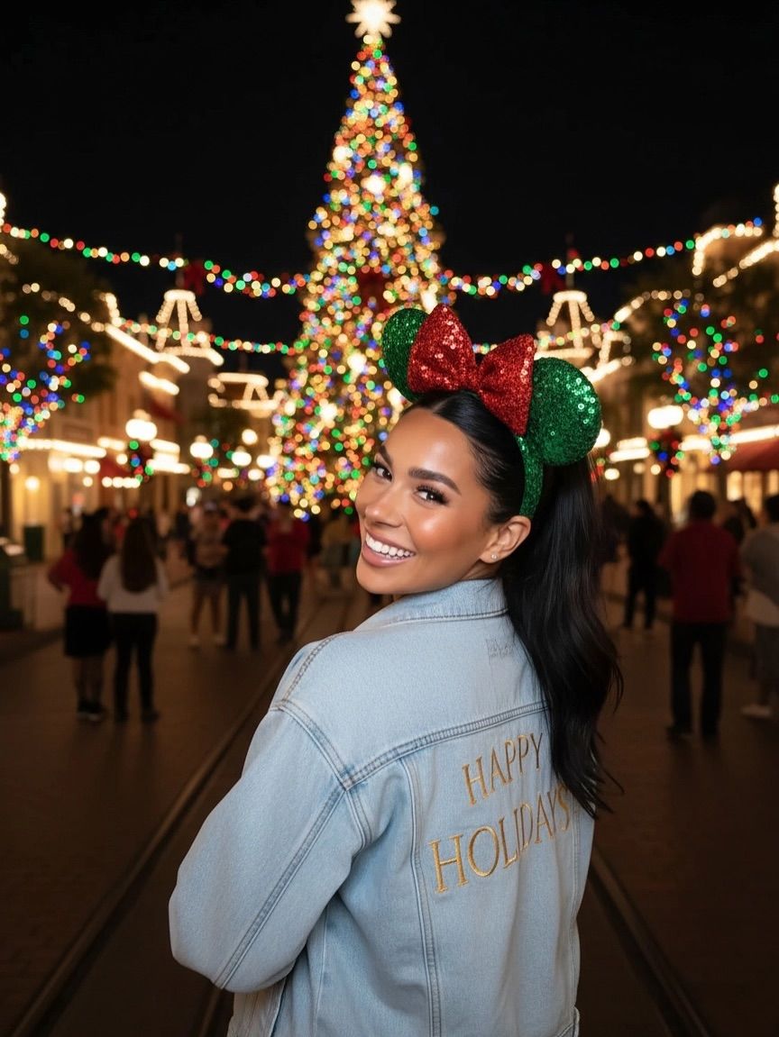 There’s nothing quite like Disney during Christmas. The lights, the music, the tree—it all calls for something festive without going full costume. This denim jacket embroidered with “Happy Holidays” hits the sweet spot. It works beautifully for cool evenings and keeps you comfortable while waiting for the nighttime parade. It’s great for all body types thanks to its relaxed fit. The glittery bow ears lean playful and feminine—pure cute energy that instantly becomes part of the holiday scenery.