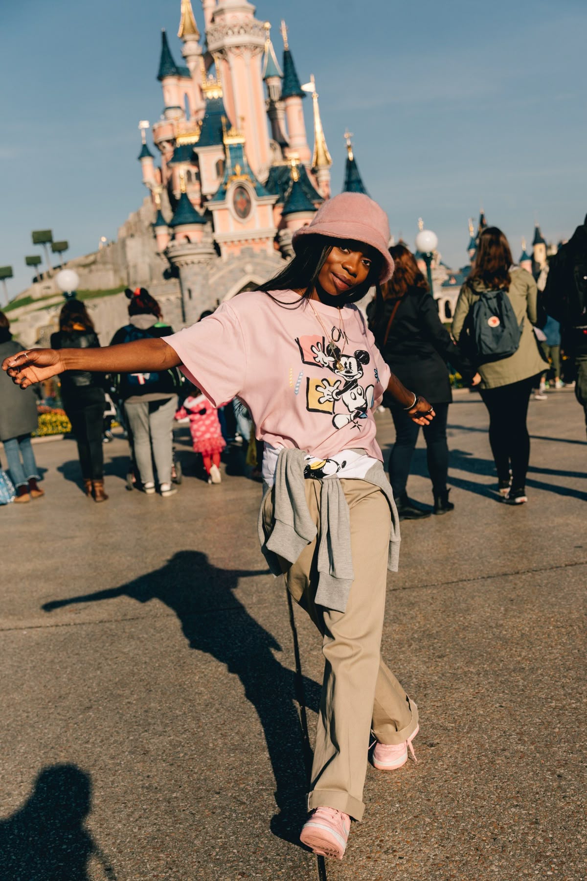 This pastel-leaning outfit feels fresh, youthful, and perfect for fans of pink, cute, and playful park dressing. The loose graphic tee featuring Mickey adds nostalgia with a modern streetwear twist, while the matching bucket hat feels very 2026—soft, warm, and practical. Great for relaxed women outfits and perfect for long park days thanks to its comfort-first approach.