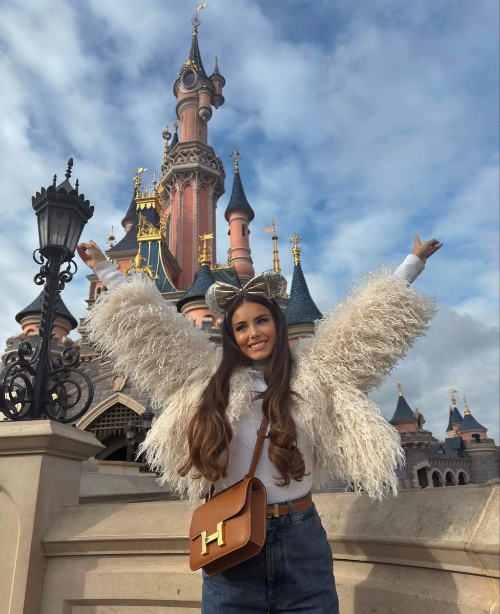 Few looks feel as magical as a fluffy cream jacket worn against the castle’s pastel turrets—like a modern Snow Queen meets Snow White’s cozy winter cousin. This outfit is perfect for cold-season visits, photoshoots, or Christmas trips with the family. The silhouette works best for taller women or anyone who loves volume on top; petite frames may feel overwhelmed by the dramatic fluff.