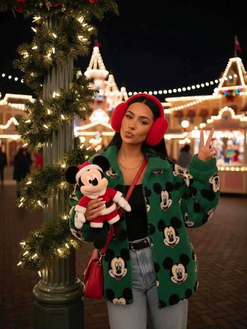 This style radiates Christmas, winter, and holiday nostalgia in the cutest way. The green sherpa jacket covered in Mickey faces feels warm, plush, and perfect for chilly evenings when Main Street is glowing with lights. Paired with classic light-wash jeans and oversized red earmuffs, it has that aesthetic vintage-holiday energy that works beautifully for nighttime parades. This outfit suits most body types, especially since the jacket adds volume in a flattering, cuddly way. It’s not the best option for warm days, though — the sherpa will be too hot.