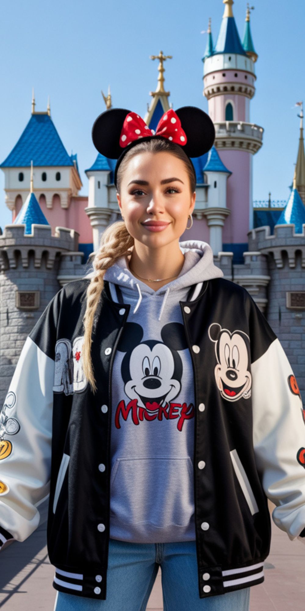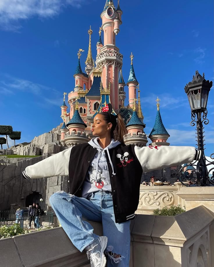 This outfit blends streetwear with a touch of vintage Mickey nostalgia. The two-tone varsity jacket is a standout moment — oversized, sporty, and visually strong. Paired with the grey Mickey hoodie and relaxed jeans, it feels like the perfect outfit for colder mornings or late-night shows. It’s also great for women who prefer comfort and loose silhouettes. I wouldn’t choose this for high-heat days, but it’s ideal for winter or cooler evenings.