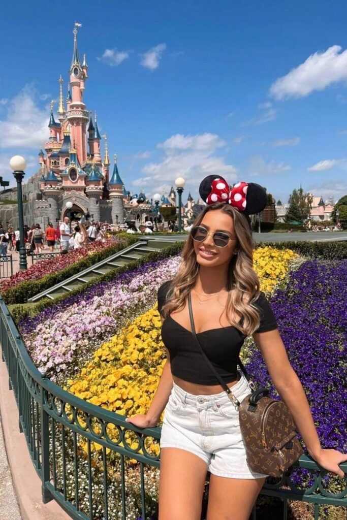 This clean summer outfit feels airy and minimalist while still nodding to the Minnie-core vibe with the ears. The black sweetheart crop top flatters the chest and shoulders, while the high-waisted white denim shorts give the silhouette that perfectly balanced hourglass shape. This is ideal for women summer days when you want to stay cool. It’s not great for very active days if you prefer more coverage, but perfect for light strolling, castle photos, or even a low-key couples trip.