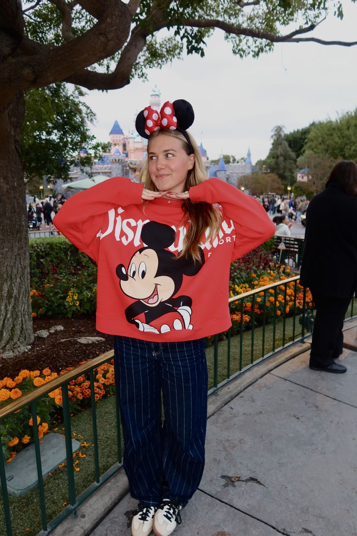 This cozy sweatshirt-and-pants pairing is pure comfort inspo — ideal for cool mornings, light rain, or relaxed park strolling. The oversized red Mickey hoodie gives the perfect amount of warmth while still keeping the look playful and bright. The navy pinstripe trousers add unexpected interest while staying soft and comfortable. This is great for October, family trips, or days when you want to lean a little into classic Disney nostalgia. Not ideal for very hot days, though.