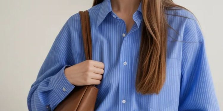 This ensemble features relaxed layering with a striped shirt over a white top, paired with beige trousers. It’s a casual yet refined look, perfect for a creative work environment.
