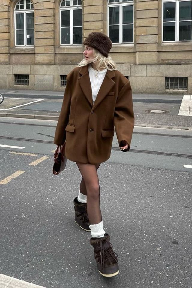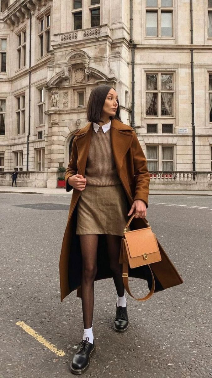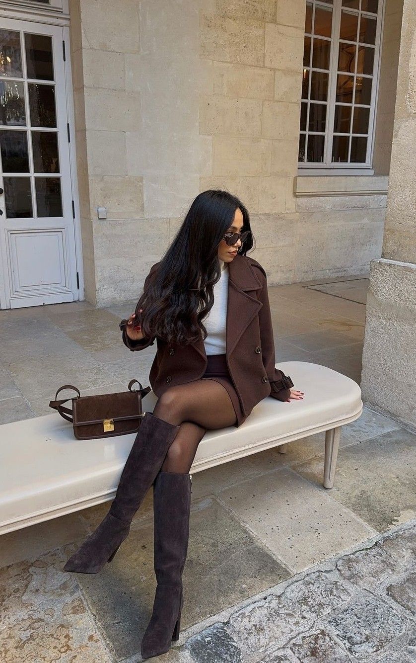 A women classy outfit grounded in rich chocolate tones. The tailored coat with a mini skirt and suede boots exudes refined street style 2024, while the monochromatic theme is particularly flattering for petite women or those wanting to appear taller. Ideal for an afternoon in Milan or an evening dinner in Madrid, but less practical for rainy weather.