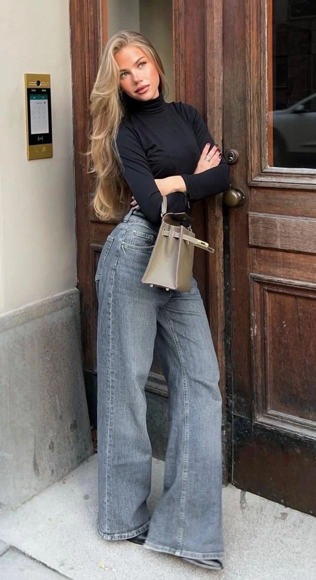 Here we see jeans in their most refined form: wide-leg, high-waisted, and paired with a black turtleneck. This silhouette is timeless, flattering especially for women classy with longer legs or those wanting to elongate their frame. It’s office-ready but also adaptable enough for street style 2025, especially when styled with a structured handbag. The vibe is minimalist, chic, and sleek—ideal for travel through cities like Milan or Berlin where simple lines reign supreme.