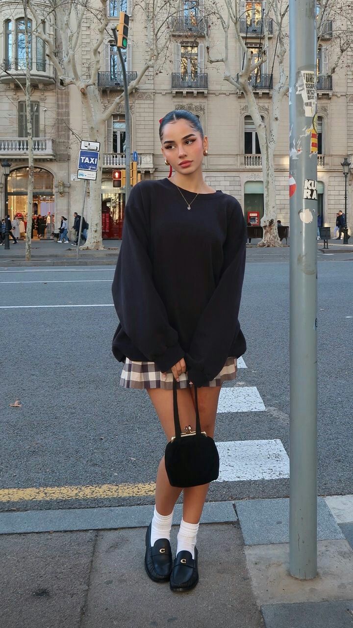 This outfit leans fully into school aesthetic with a plaid mini skirt, oversized black sweater, and chunky loafers. The proportions here are playful—large on top, short on bottom—making it especially flattering for petite women casual who want their legs elongated. The look channels a mix of Parisian prep and street style women, effortless and age-defying. Perfect for weekend strolls, campus vibes, or fall afternoons in Spain.