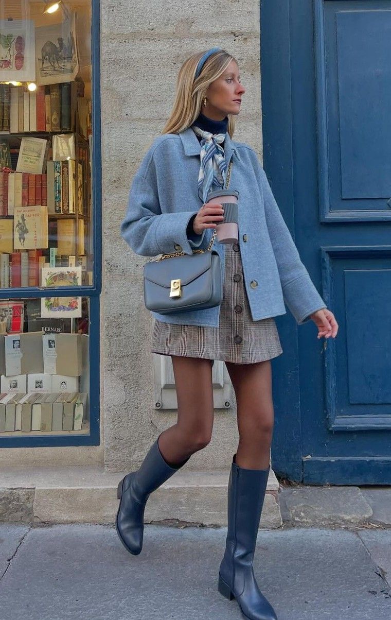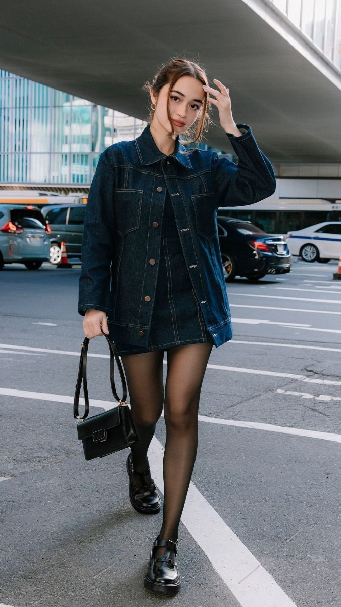 Denim has returned as a full street style 2024 uniform. Here, a dark indigo jacket is styled over a denim mini, paired with black tights and chunky loafers. It’s cool, edgy, and slightly school-inspired. Perfect for women casual with petite frames, since the mini and tights elongate legs. Think autumn nights in Eastern Europe, where denim has cultural resonance.