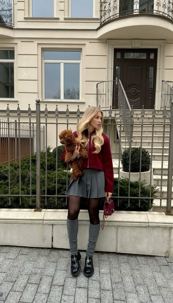 This look is quintessential European street style 2024: a deep red blazer styled over a white shirt and black mini, paired with tights and loafers. It’s sharp yet playful, perfect for women who love chic tailoring with a youthful twist. This outfit screams travel—imagine cycling through Amsterdam’s canals (as in the setting here), weaving fashion inspo into everyday life.