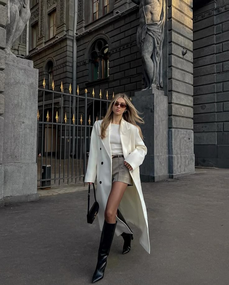 This outfit breathes chic inspo from head to toe. A textured white blazer, belted to highlight the waistline, floats over a sleek pair of leather shorts and tall boots. It’s a women classy look that suits hourglass and plus size figures since the belt creates definition without bulk. It works perfectly for travel in Eastern Europe’s cooler climate — think Prague or Warsaw — where elegance meets practicality.