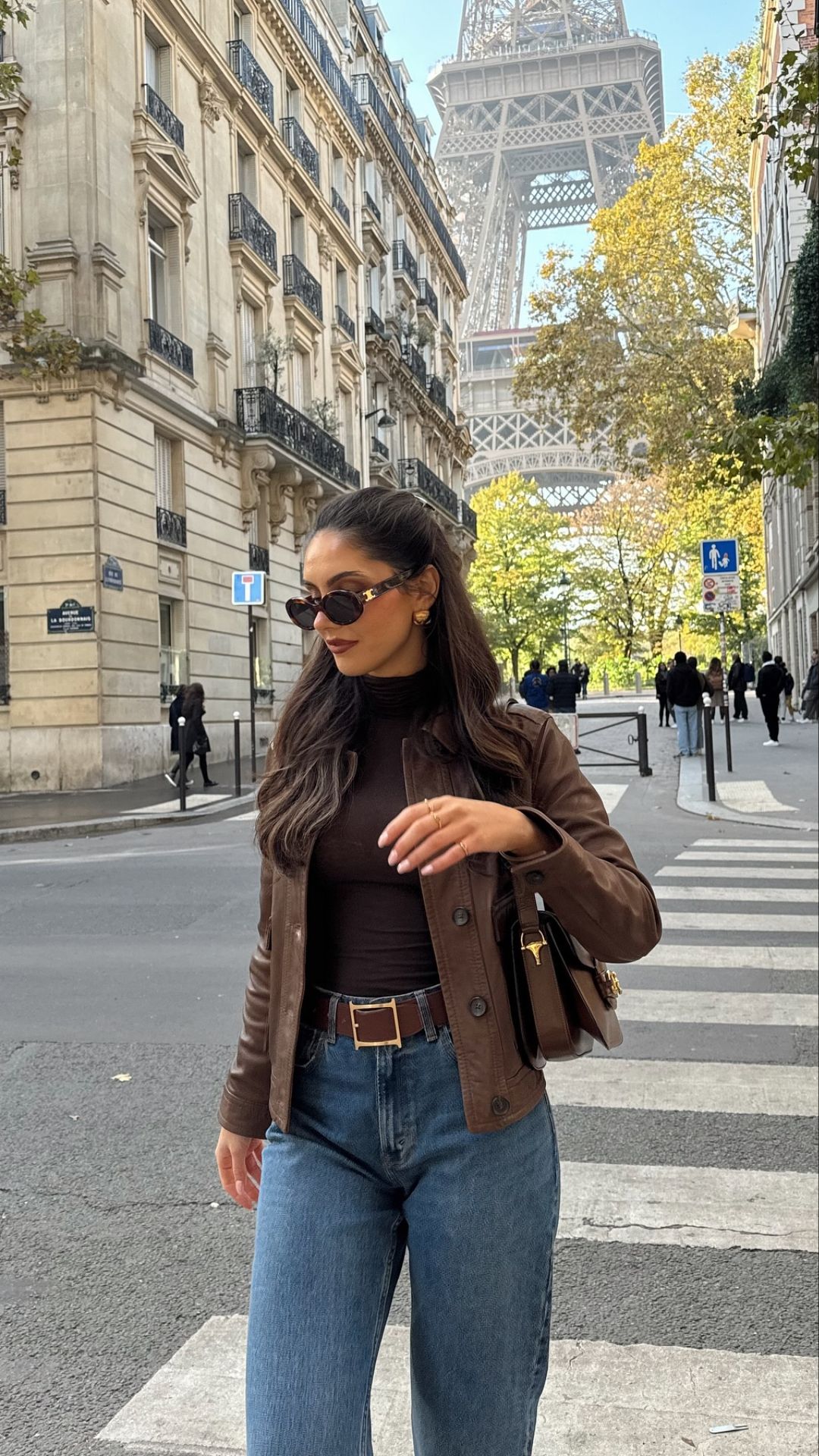 A black cropped sweater with dramatic sleeves paired with ultra-wide jeans makes this outfit high-impact yet wearable. It’s bold, leaning into street style 2025 and perfect for midsize women who want to highlight the waistline while balancing proportions. The outfit thrives in urban settings, especially during autumn travel where layering is easy.