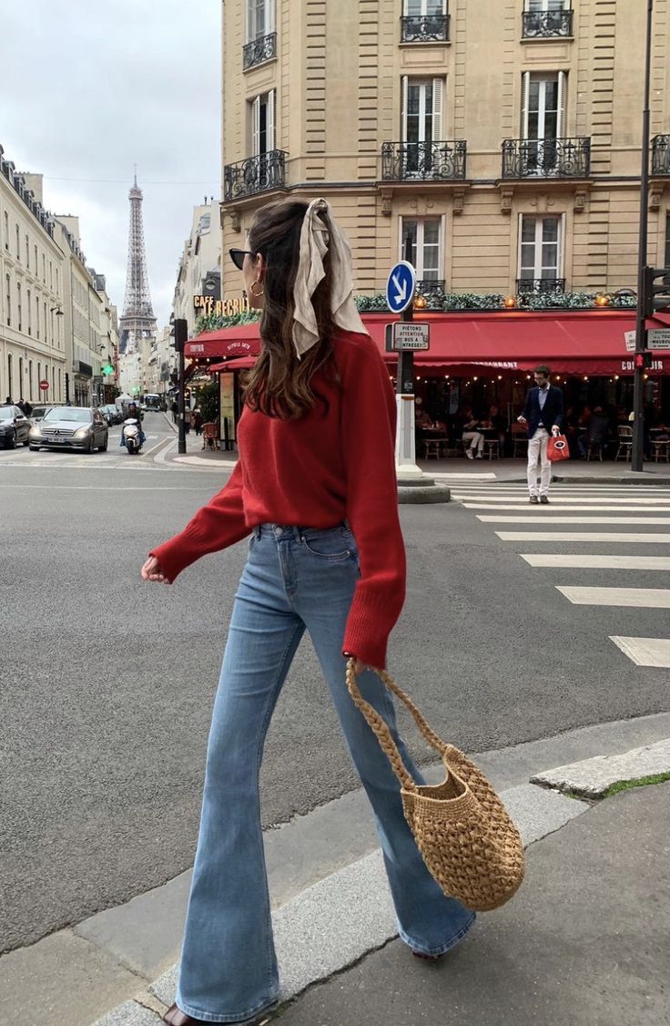 Here, we see the epitome of European street style women: flared jeans paired with a red knit sweater, topped with a romantic ribbon in the hair. It’s the ultimate casual inspo, perfect for travel days spent walking through Paris or Spain with equal ease. This style is universally flattering, especially on midsize and plus size women, because flared jeans balance the hips beautifully.