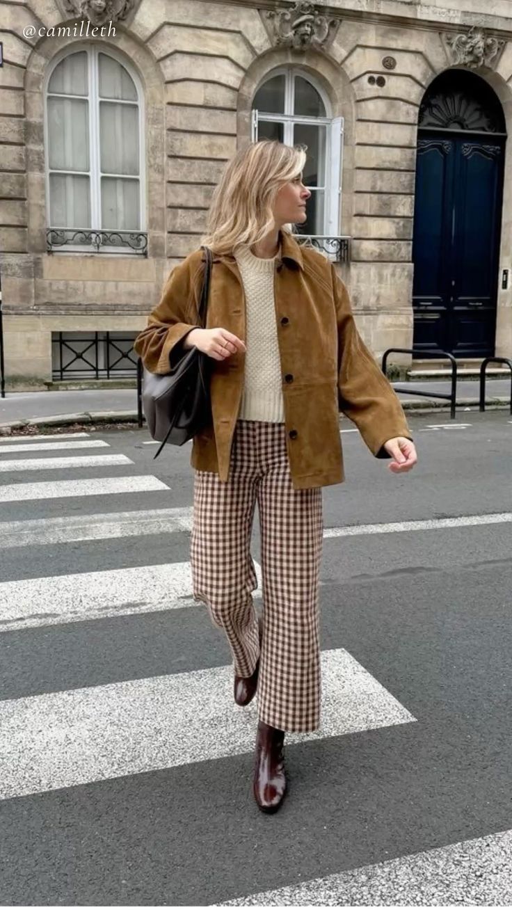 A long camel coat takes center stage, cinching the outfit with an intellectual edge. The layered knit vest over a crisp white shirt paired with a plaid skirt feels academic yet modern, the kind of street style women look you’d see outside universities in Paris or Madrid. This ensemble works beautifully on slim and midsize body types, elongating the frame with the vertical lines of the coat. It’s not for long commutes in pouring rain, but perfect for women casual city walks, coffee catch-ups, or even a day of museum-hopping during travel.