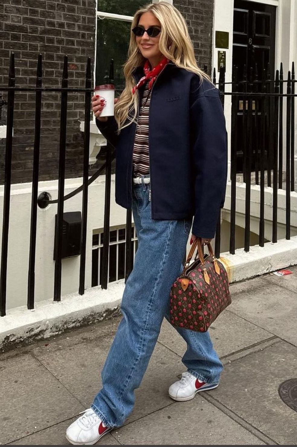 Relaxed jeans, striped top, and sporty sneakers create pure casual inspo. The navy jacket and red scarf bring in Eastern-European street style 2024 energy, making this perfect for travel or school. It’s body-type friendly, ideal for midsize women who enjoy comfort without losing edge.