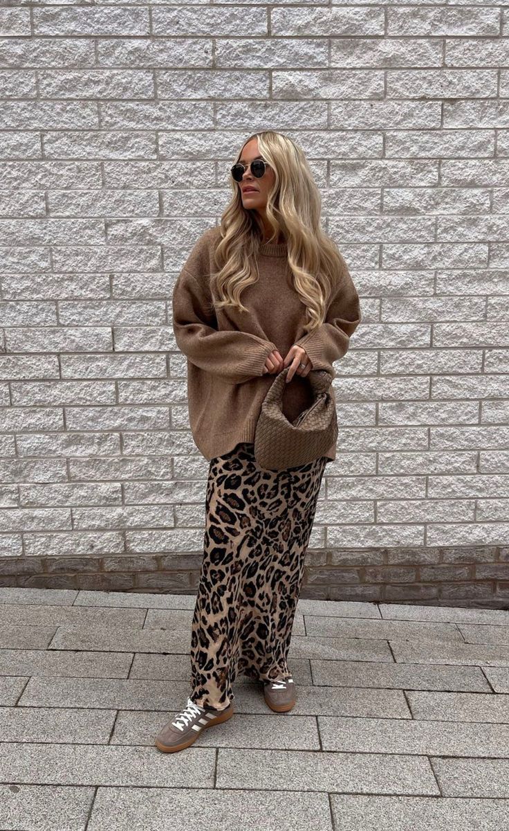 An oversized camel-toned sweater paired with a flowing leopard-print skirt creates a striking play between comfort and boldness. This combination works beautifully for women casual days—perfect for midsize or plus size figures, since the loose knit balances the daring skirt while offering both coverage and softness. A look like this is versatile: café meetups, quick school runs, or laid-back travel through Eastern European cities where coziness is key.