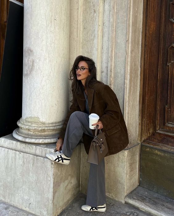 Imagine stepping out on a brisk autumn morning, the air filled with the scent of fallen leaves and freshly brewed coffee. This outfit captures that essence perfectly, featuring a cozy, oversized brown suede jacket paired with wide-leg grey trousers and casual sneakers. The dark, sophisticated tones are complemented by a sleek handbag, making this look ideal for a relaxed yet stylish brunch.