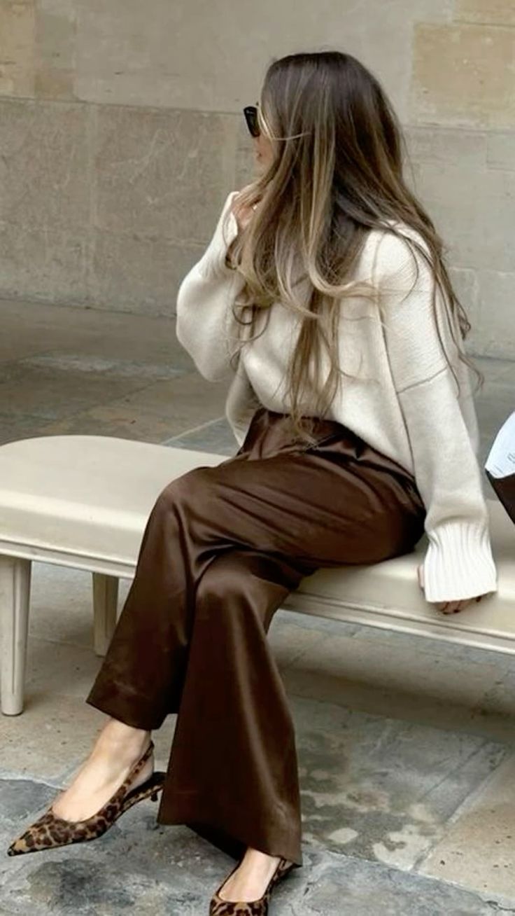 This ensemble is the epitome of classy sophistication with a touch of cozy comfort. The creamy oversized sweater paired with luxurious brown satin wide-leg pants creates a harmonious balance of textures. Leopard-print heels add a bold statement, making this outfit suitable for a more upscale brunch setting or a bridal shower.