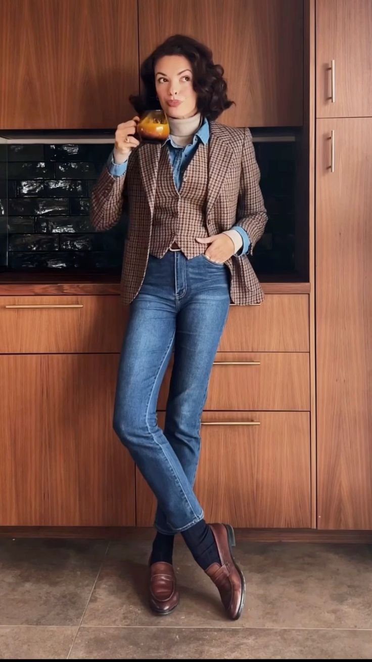 Channel your inner fashionista with this vintage-inspired outfit that blends modern sensibilities with a touch of old-school charm. A checked blazer and vest combination over a classic denim ensemble creates a sophisticated yet relaxed look, perfect for a Sunday brunch or a casual meet-up with friends.