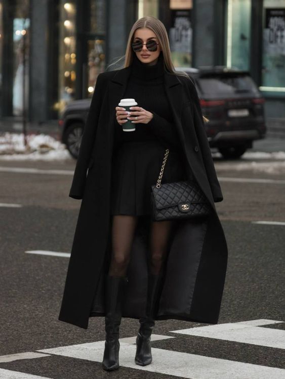 This all-black ensemble exudes chic sophistication, perfect for a stylish brunch in NYC or a special birthday celebration. A long black coat paired with a black turtleneck and mini skirt creates a streamlined, elegant look that is both warm and stylish.