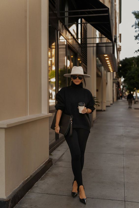 This outfit perfectly balances comfort and style, making it ideal for a cozy Sunday brunch or a relaxed day out. The oversized black sweater paired with fitted black leggings creates a sleek silhouette, while the wide-brim hat adds a touch of drama.