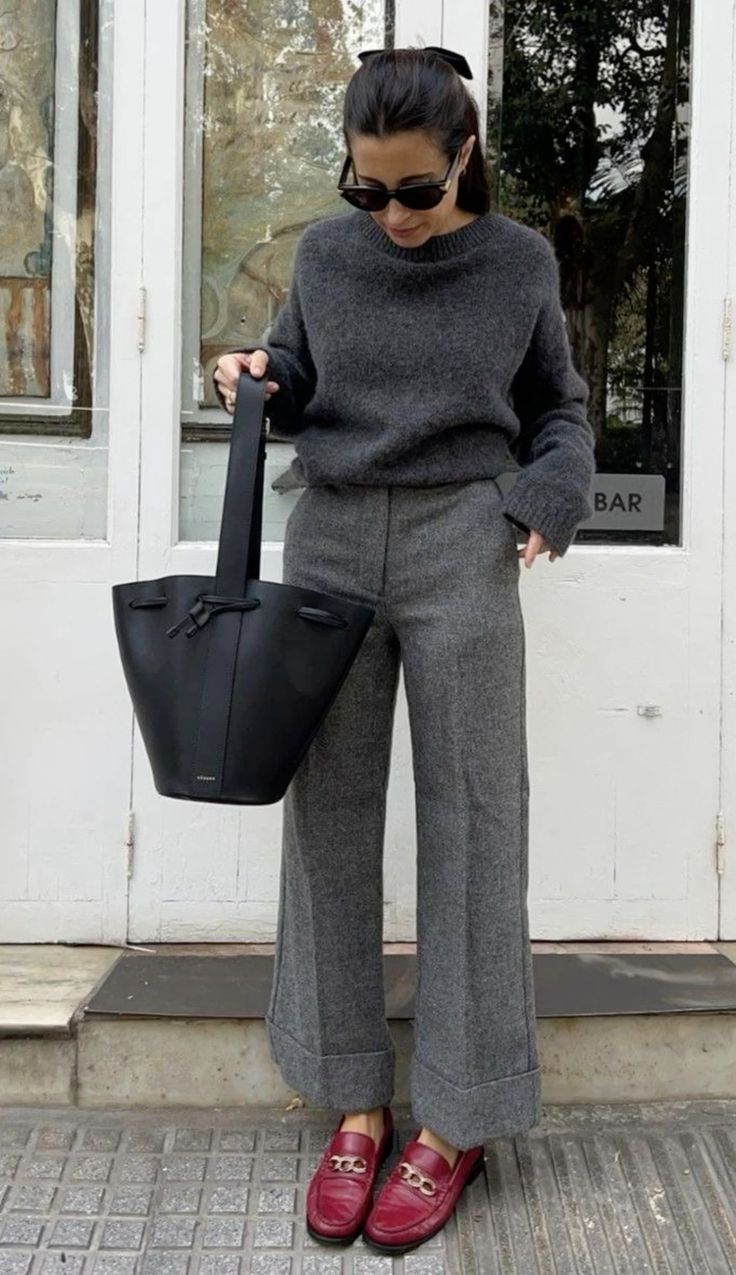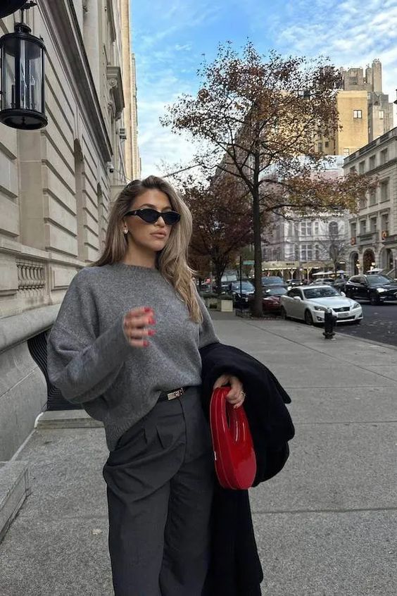 Combining comfort and sophistication, this gray and red outfit is perfect for a laid-back yet stylish brunch.