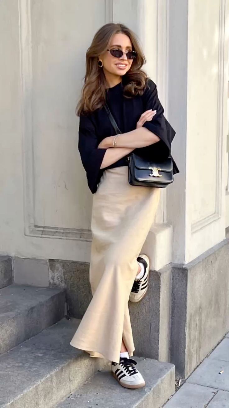 - Beige Maxi Skirt: Flowy and comfortable, perfect for a relaxed yet stylish appearance.