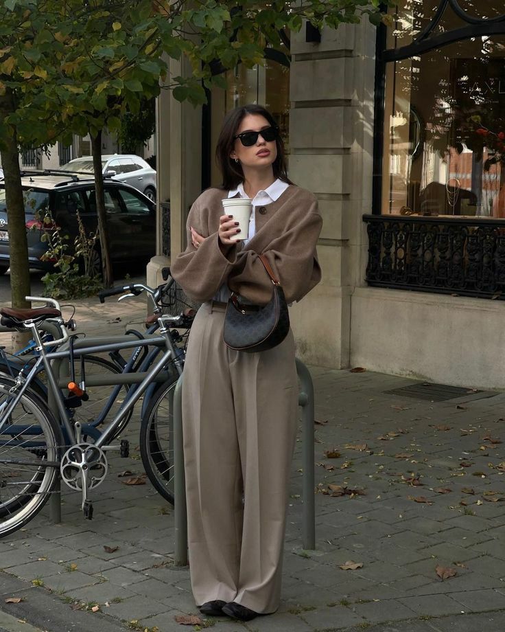 This outfit is the epitome of fall chic, combining different shades of beige and white for a soft, harmonious look. Perfect for a Sunday brunch or a casual birthday gathering.