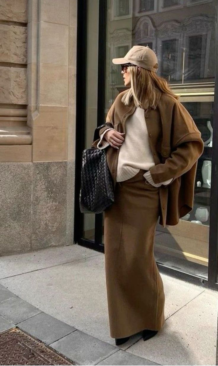 For a touch of urban elegance, a camel coat paired with a leather skirt creates a striking ensemble. This outfit is perfect for a Sunday brunch in the city or a birthday celebration.