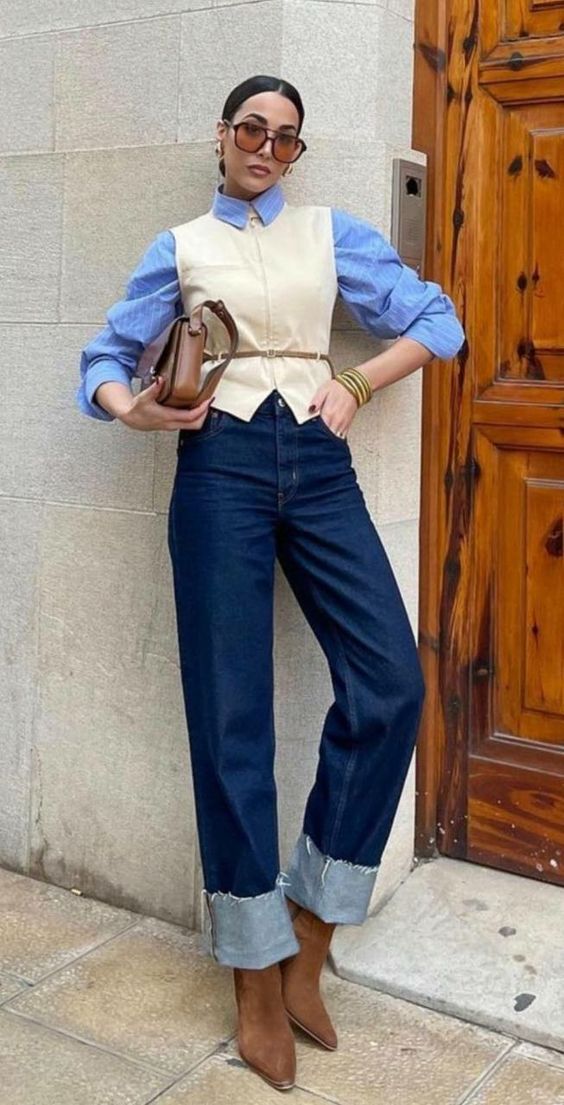 A vest over a shirt and denim combination is a unique, structured look that exudes confidence and style. Perfect for a brunch outing with friends or a casual business meeting.