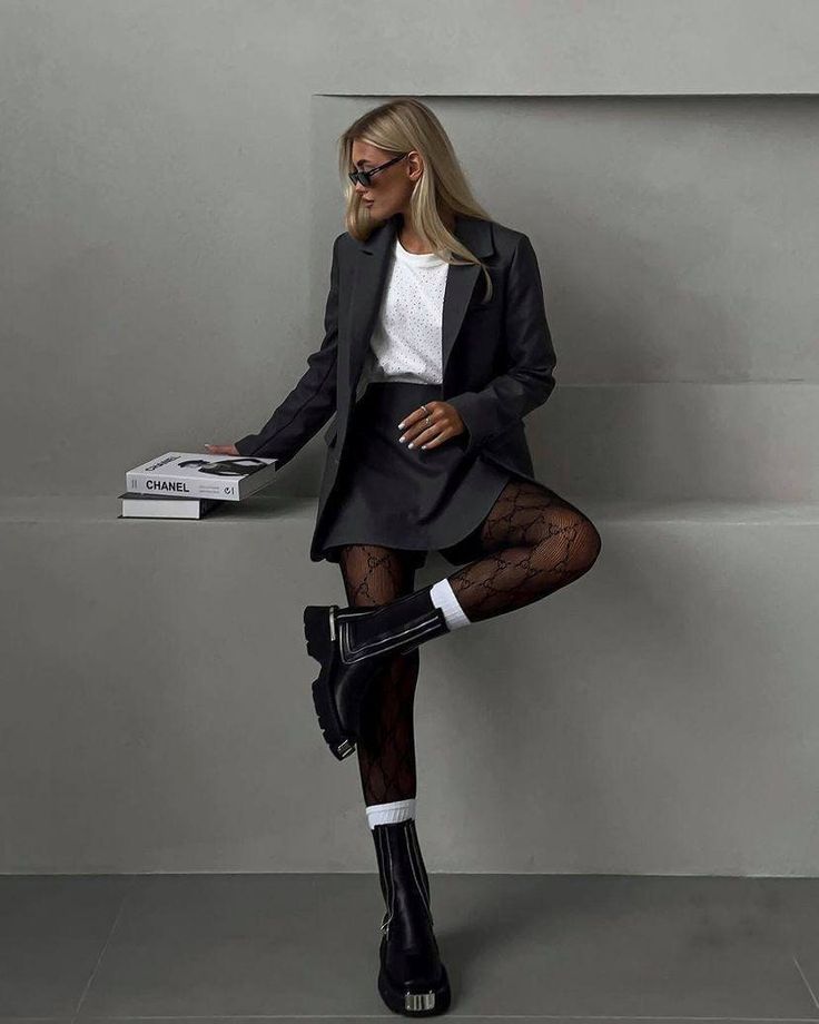 This outfit is a stunning combination of edgy and elegant. The tailored black blazer paired with a white tee and mini skirt creates a casual classy vibe perfect for a Sunday brunch in NYC.