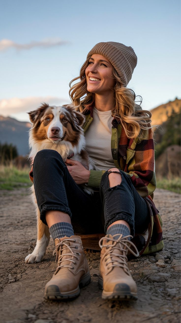 This outfit screams golden hour hikes in Montana with your four-legged trail buddy by your side. A soft granola plaid shacket anchors the entire look — relaxed, woodsy, and easy to throw over anything. Paired with black distressed jeans and chunky hiking boots, it’s giving cabin-core with a practical twist. The ribbed beanie isn’t just cute — it keeps your ears toasty when those early morning hikes get brisk. Best suited for straight or athletic body types, this combo might overwhelm petite frames unless you cuff or tailor.