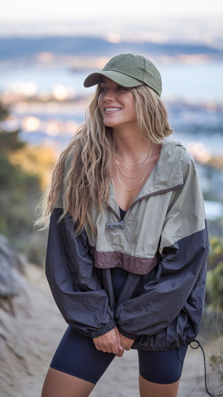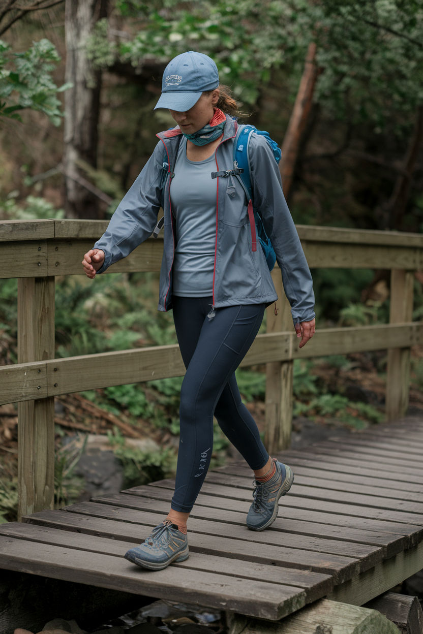 This outfit is for the woman who likes her hikes with a side of style. The color palette is neutral and polished — high-rise navy leggings paired with a soft blush base layer and matching overshirt. The silhouette is flattering for most body types, especially curvy and petite figures thanks to the tucked-in waist and streamlined fit. Perfect for hot weather hikes in Arizona or early fall outings that require sun coverage without overheating.